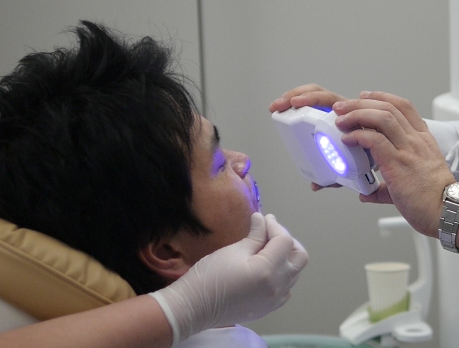 口腔内蛍光観察装置でお口の中に青色光を当てて、異常がないか観察をします。そのままお口の中の状態を写真撮影します。